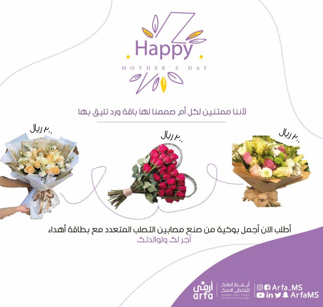 بادرت 8 مصابات بالتصلب المتعدد في الدمام، بتنسيق وتصميم عدد من باقات الورود، بمناسبة اليوم العالمي للأم، بعد إتمام الدورة التدريبية والتأهيلية التي نفذتها جمعية أرفى للتصلب المتعدد عبر برنامج ”مِراس“ للتأهيل والتدريب في مقر الجمعية الأسبوع المنصرم.