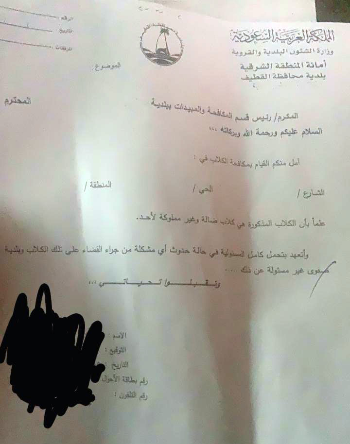 وتحمل البلدية، صاحب الشكوى، المسئولية من جراء القضاء على هذه الكلاب، من خلال هذا التعهد، بهدف إخلاء مسؤوليتها. فيما أكدت بلدية محافظة القطيف ان هذا التعهد اوقف قبل سنتين.