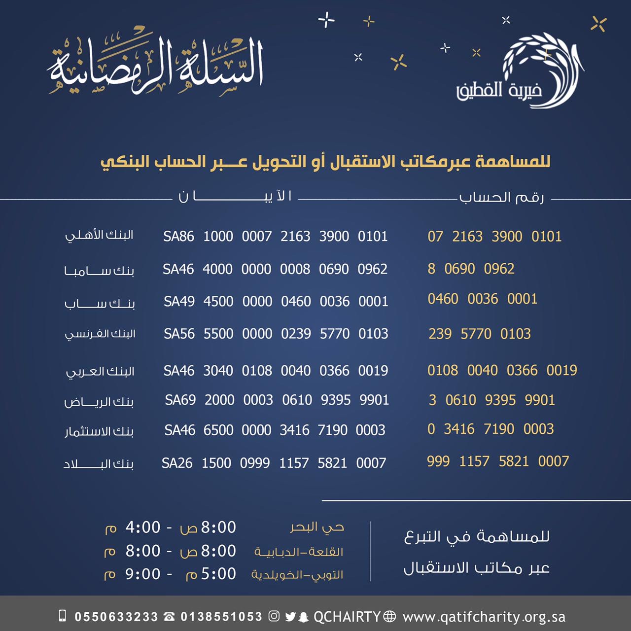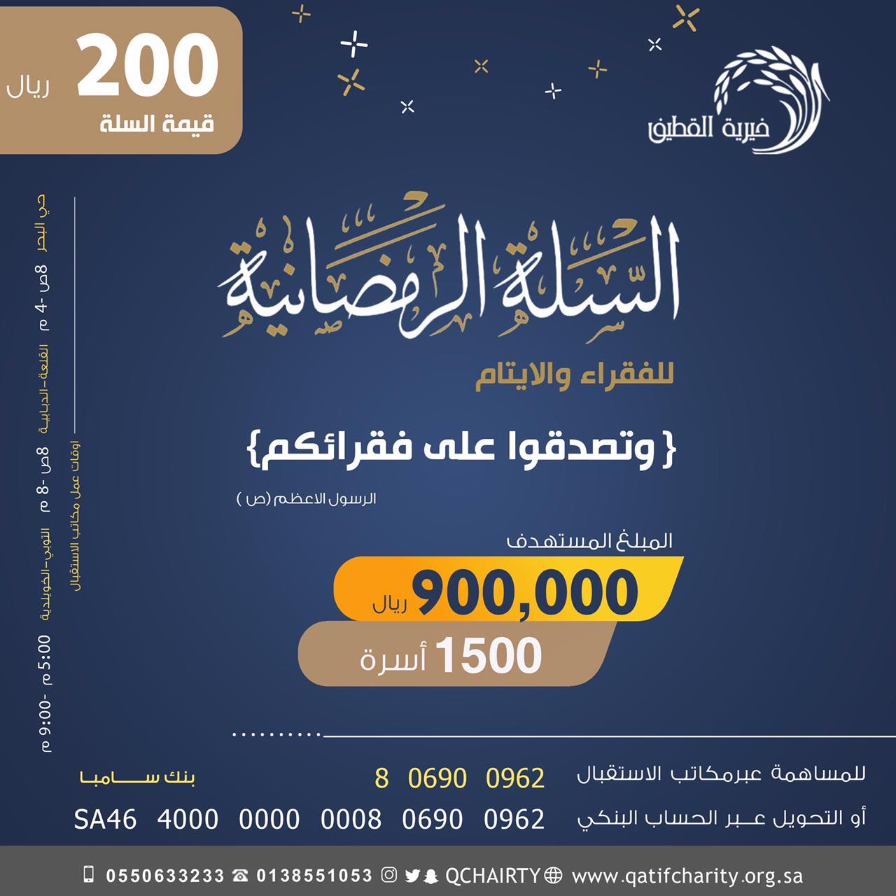 ويمكن دعم المحتاجين ب ”السلة الرمضانية“ من خلال مكاتب خيرية القطيف أو الإيداع البنكي في حسابات المبادرة الموجودة في الإعلان.