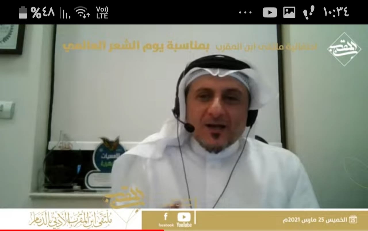 احتفى ملتقى ابن المقرب الأدبي بالدمام، عبر قنواته الإعلامية، ب ”يوم الشعر العالمي“، أمس، مستضيفًا نخبة من الشعراء المميزين.