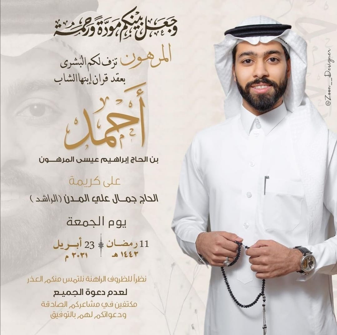 احتفلت عائلة المرهون والمدن في سيهات مساء يوم الجمعة بعقد قران الشاب أحمد ابراهيم عيسى المرهون على كريمة الحاج جمال علي المدن - الراشد - وسط فرحة الأهل والأصدقاء ومحبي العريسين.