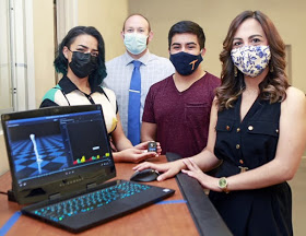 الاستاذ المساعد في علم الحركة في جامعة تكساس في إلباسو UTEP جيفري ايغلستون Eggleston الثاني من اليسار، ومساعدي البحوث أليسا أوليفاس، أقصى اليمين، وإميلي تشافيز، أقصى اليسار، يستخدمون الرسوم المتحركة ثلاثية الأبعاد في الوقت الفعلي لدراسة الإعاقة الحركية في أطفال التوحد. وانضم اليهم أوريل كابانيلاس،، طالب زراسات عليا في علم الحركة، الثاني من اليمين.