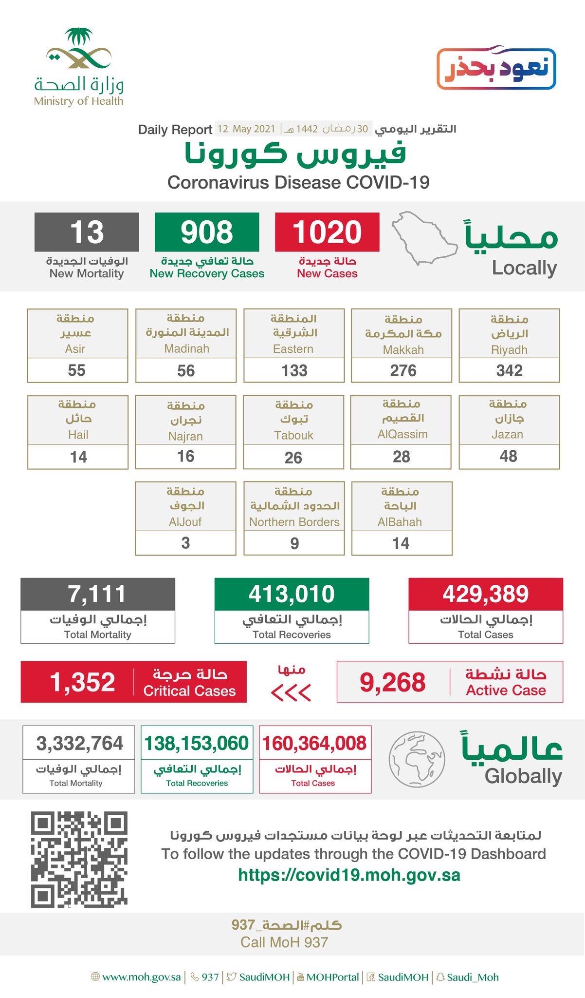 كما أعلنت الصحة عن تسجيل ”908“ حالة تماثلت للشفاء، ليصل مجموع المتعافين إلى ”413010“ حالة تعافي، فيما ارتفع إجمالي الوفيات في المملكة إلى ”7111“ حالة بعد تسجيل ”13“ حالة وفاة جديدة.