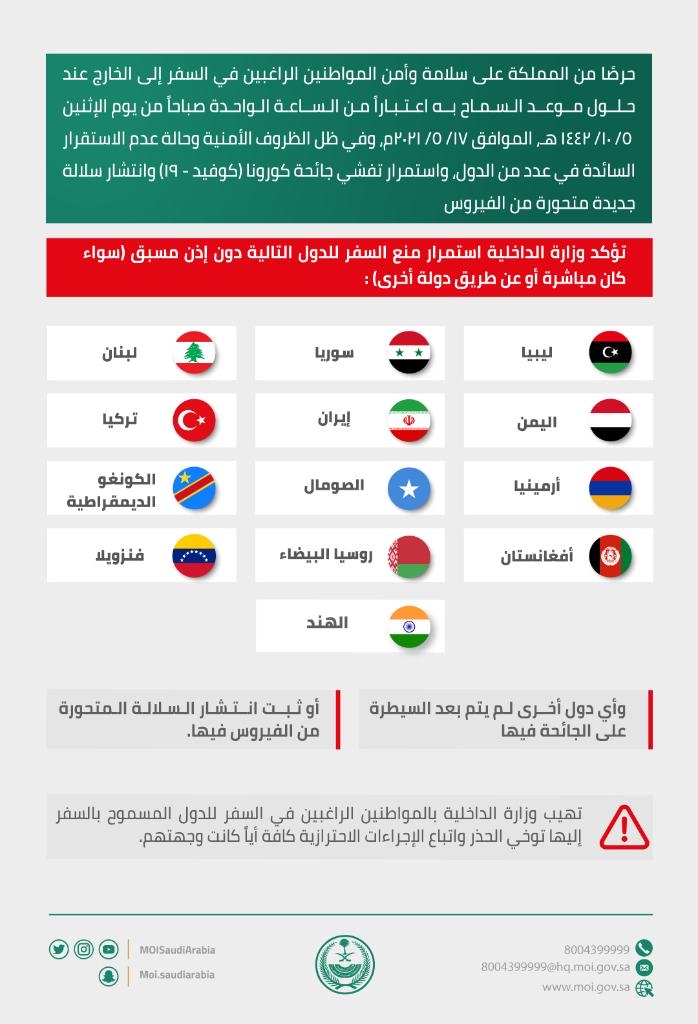 صرّح مصدر مسؤول في وزارة الداخلية بأنه إلحاقاً للبيان الصادر بتاريخ 29 جمادى الأولى 1442ه الموافق 13 يناير 2021م بشأن التحذير من السفر إلى عدد من الدول، وحرصاً من المملكة على سلامة وأمن المواطنين الراغبين في السفر إلى الخارج عند حلول موعد السماح به اعتباراً من الساعة الواحدة صباحاً من يوم الاثنين 5 / 10 / 1442ه الموافق 17 / 5 / 2021م، وفي ظل الظروف الأمنية وحالة عدم الاستقرار السائدة في عدد من الدول، واستمرار تفشي جائحة كورونا «كوفيد 19» وانتشار سلالة جديدة متحورة من الفيروس، تؤكد وزارة الداخلية على المواطنين استمرار منع السفر، سواءً مباشرة أو عن طريق دولة أخرى، إلى الدول التالية دون الحصول على إذن مسبق من الجهات المعنية، وهي: «ليبيا، سوريا، لبنان، اليمن، إيران، تركيا، أرمينيا، الصومال، الكونغو الديمقراطية، أفغانستان، فنزويلا، روسيا البيضاء، الهند»، وأي دول أخرى لم يتم بعد السيطرة على الجائحة فيها أو ثبت انتشار السلالة المتحورة من الفيروس فيها.