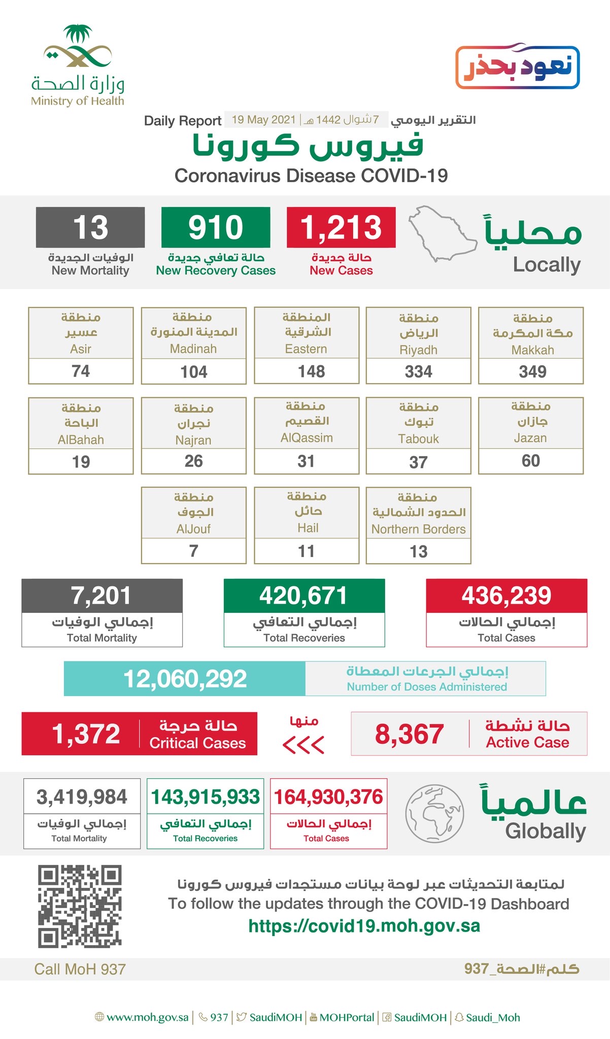 أعلنت وزارة الصحة إحصائية جديدة لمستجدات كورونا في المملكة خلال ال 24 ساعة الماضية تضمنت تسجيل 1213 حالة مؤكدة. منها ”3“ في القطيف و”3“ بصفوى.