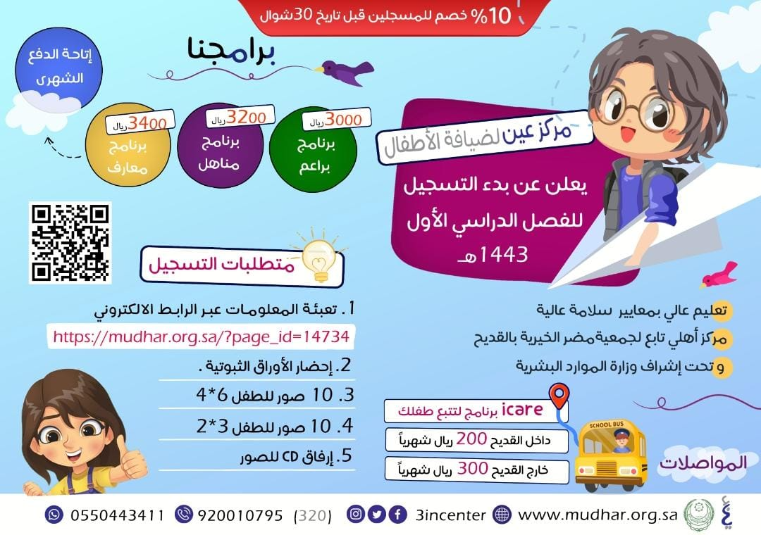 يعلن مركز ”عين“ لضيافة الأطفال التابع لجمعية مضر الخيرية بالقديح عن بدء التسجيل للفصل الدراسي الأول، والذي يعمل تحت إشراف وزارة الموارد البشرية.
