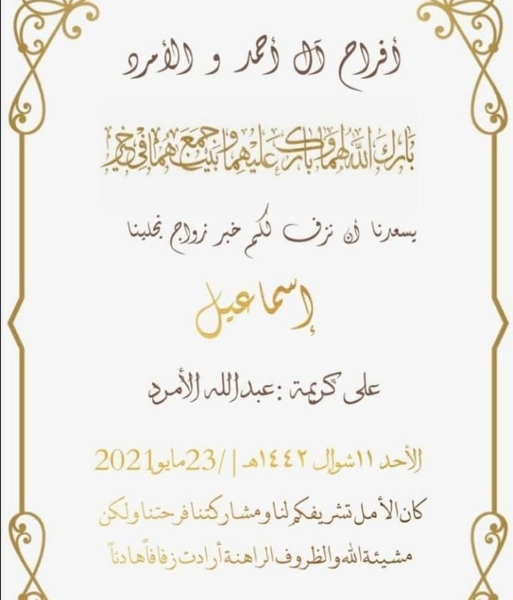 تحتفل عائلة آل أحمد والأمرد في الجارودية مساء يوم الأحد بزفاف الشاب اسماعيل آل أحمد على كريمة الحاج عبدالله الأمرد وسط فرحة الأهل والأصدقاء ومحبي العريسين.