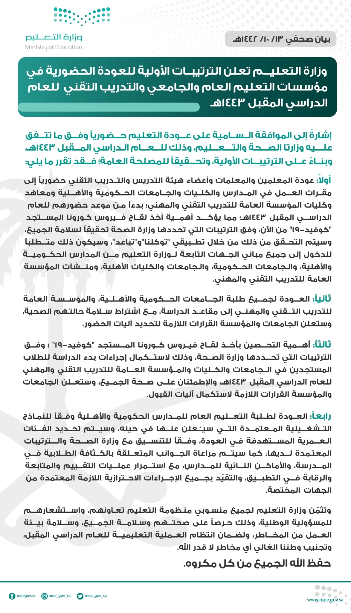 وذكرت في بيان بثته عبر تويتر.. إشارة إلى الموافقة السامية على عودة التعليم حضوريا وفق ما تتفق عليه وزارتا الصحة والتعليم، وذلك للعام الدراسي المقبل 443اه، وبناء على الترتيبات الأولية، وتحقيقا للمصلحة العامة؛ فقد تقرر ما يلي: