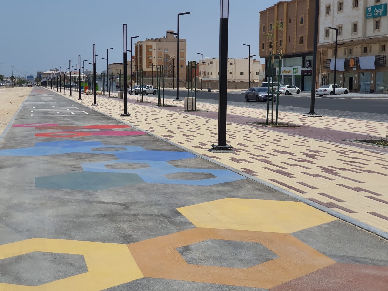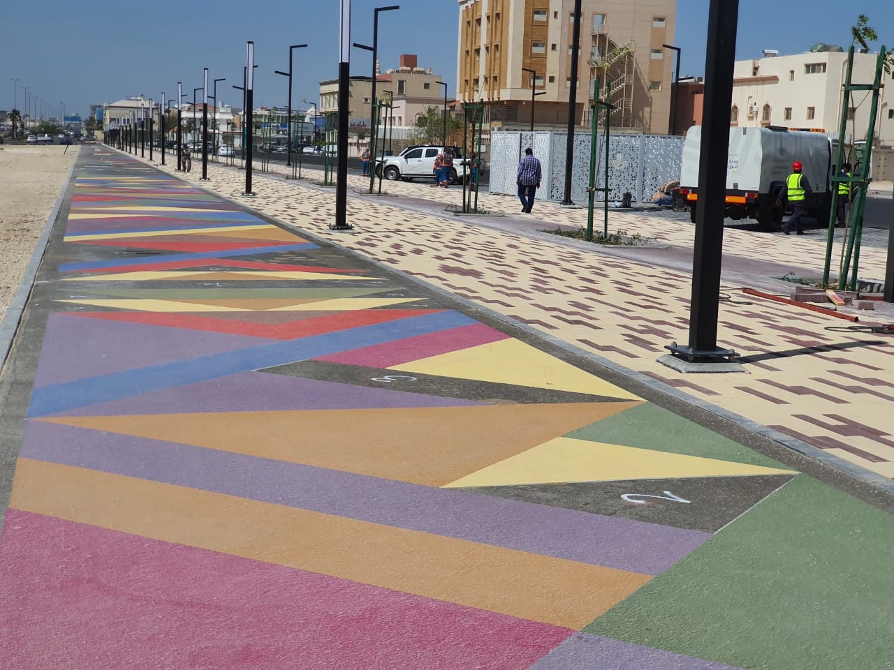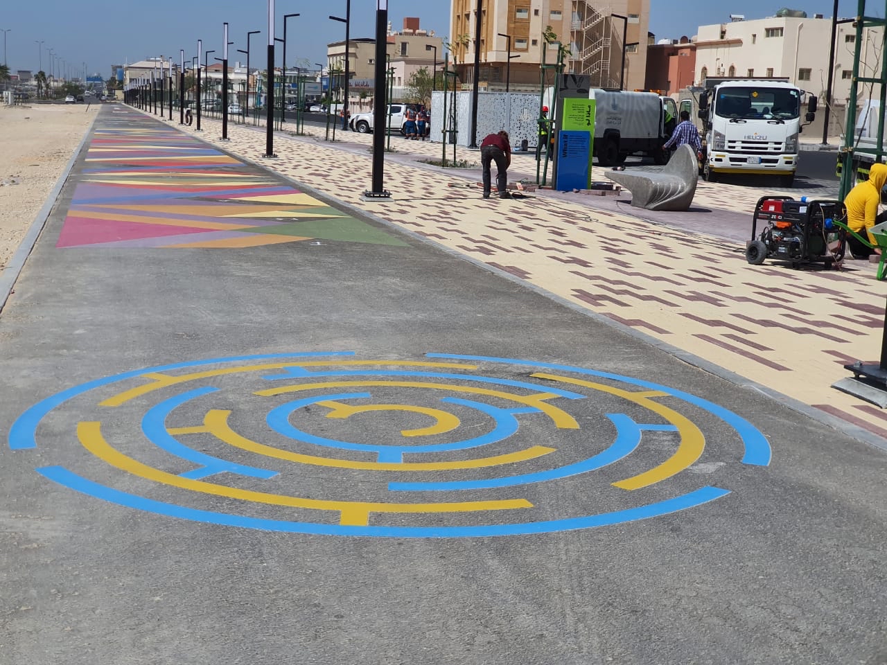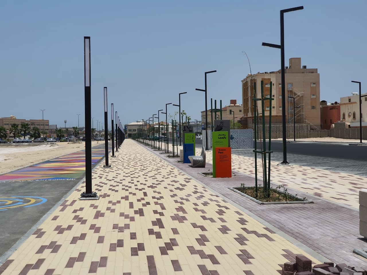 وأضاف: إنه يحتوي على عدة عناصر تفاعلية؛ مثل ألعاب حركية للأطفال بعضها يحاكي الألعاب التراثية، وبعضها ألعاب تعليمية وتثقيفية، والبعض الآخر رسومات فنية هندسية تضفي روح البهجة والنشاط للزوار، كما تم عمل أفكار تصميمية لجذب المارة على الطريق؛ وهي عبارة عن عدة أقواس حديدية تم دهانها بألوان جذابة، ووُضعت في أول الممشى وجارٍ تركيبها في منتصف الممشى وآخره، وهي بدورها تجذب عيون المارة وتثير فضولهم للذهاب واكتشاف ما يحتويه هذا الممشى، ويعتبر هذا الممشى الأول من نوعه في الدمام، لافتًا إلى أنه يتبقى تركيب جميع الكراسي والحاويات واستكمال الرسومات التفاعلية، وذلك خلال الفترة القليلة القادمة.