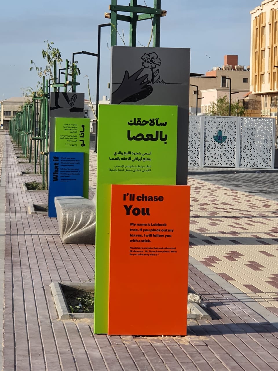 وأشار إلى أن التصميم والتفاصيل التي فيه استُلهما من سمات المنطقة الشرقية، إضافة إلى وضع لوحات إرشادية مصنوعة من ألواح الألومنيوم تحتوي على عبارات توعوية مبتكرة للمحافظة على البيئة والأشجار، كما تمت إنارة الممشى بتركيب إضاءات ديكورية بارتفاع 3 أمتار على طول الممشى، كما أنه تمت إضافة ممشى من الأسفلت الملون بعرض 4 أمتار وطول 500 متر، وهو ممشى نوعي تم تصميمه بفكرة ما يُعرف ب ”Tactical Urbanism“.