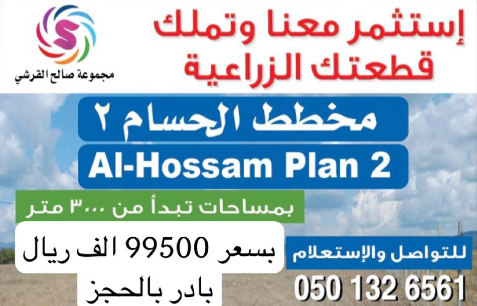 مخطط الحسام 2 الزراعي  - غرب مطار الدمام - بدأ البيع وهو عبارة عن شرائح زراعية بمساحات 3000 متر مربع، تبدأ وبسعر 99500 ريال.