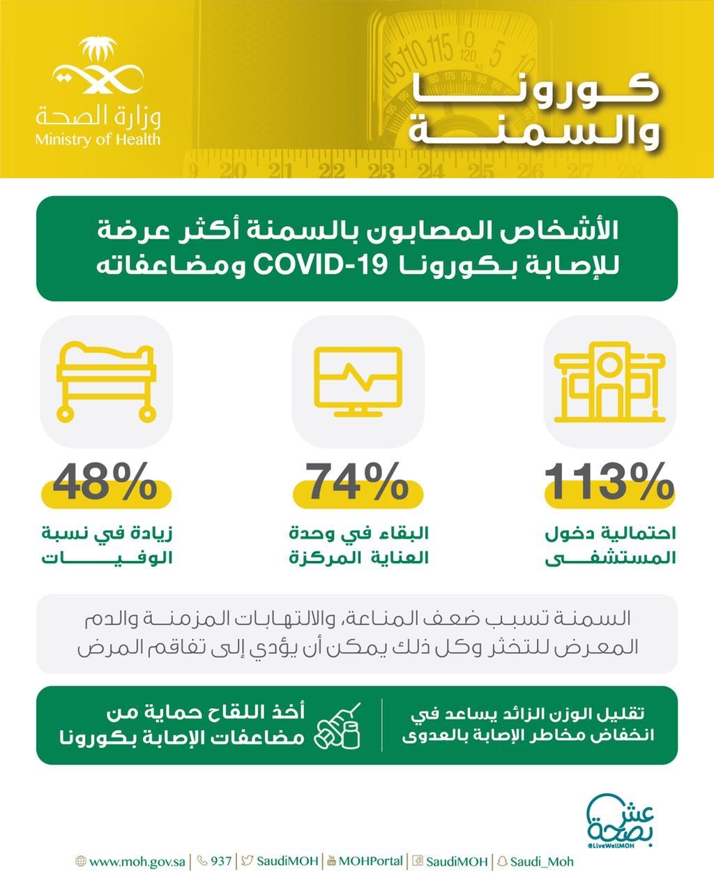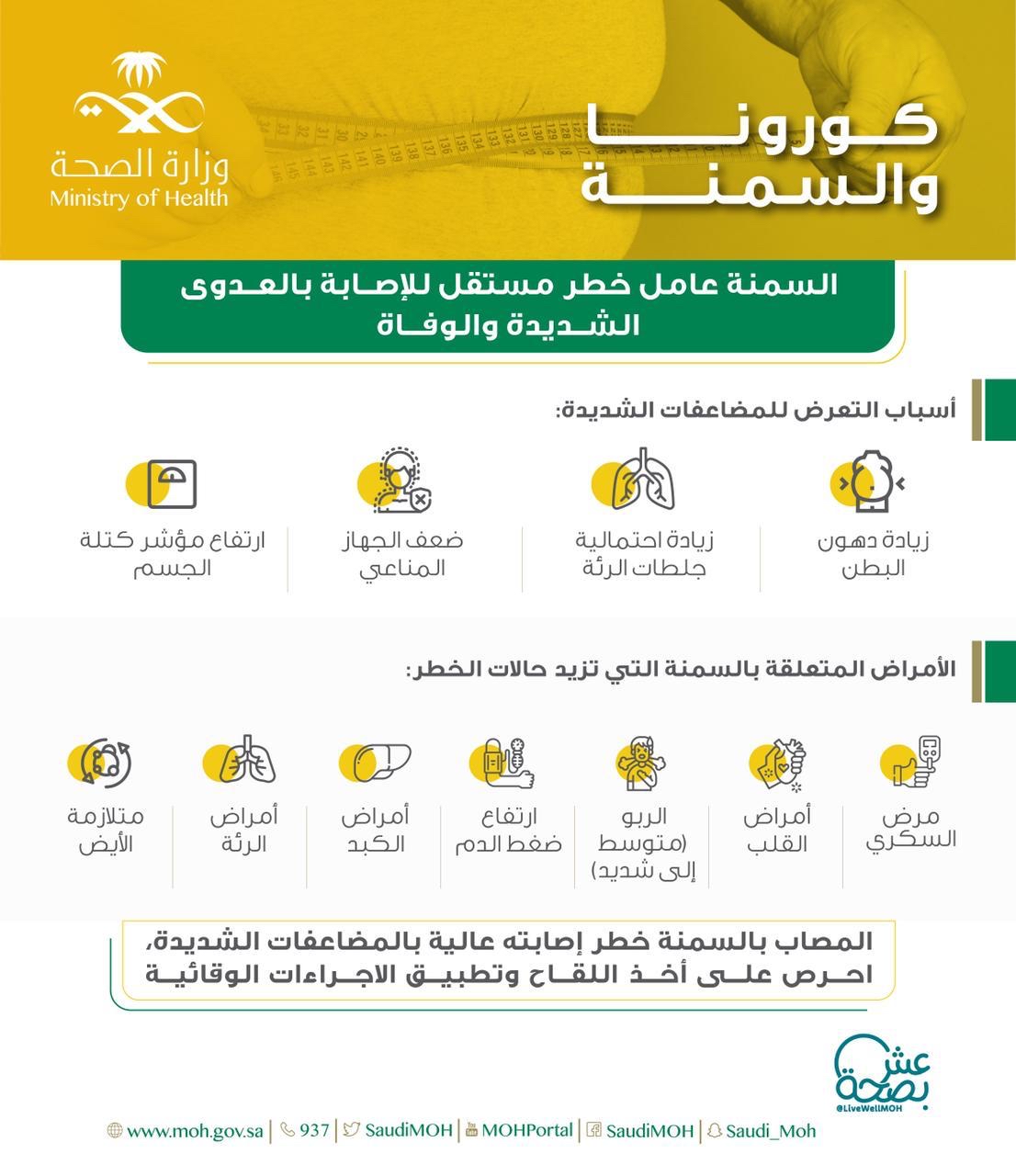 ونشرت «الصحة» عبر حسابها في تويتر ومنصتها التوعوية «عش بصحة» إنفوغرافيك للتعريف بمخاطر السمنة والأمراض المصاحبة جراء الإصابة بهذا المرض، مبينةً أن السمنة تسبب ضعف المناعة والالتهابات المزمنة والدم المعرض للتخثر ويمكن أن تؤدي - لا سمح الله - إلى تفاقم المرض.