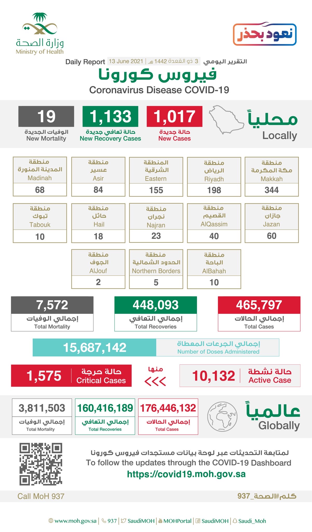 وبينت الإحصائية أن إجمالي عدد الإصابات في المملكة بلغ 465797 حالة.