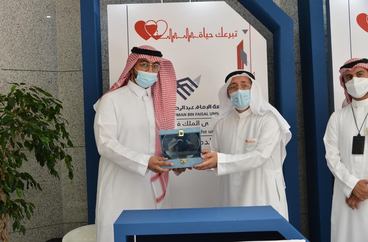 كرم رئيس جامعة الإمام عبدالرحمن بن فيصل الدكتور عبدالله الربيش اليوم، المتبرعين بالدم لمستشفى الملك فهد الجامعي بالخبر التابع للجامعة، بمناسبة اليوم العالمي للتبرع بالدم تحت عنوان ”تبرعوا بالدم واجعلوا العالم ينبض بالحياة“، بحضور مدير المستشفى الدكتور محمد الشهراني، وعدد من المسؤولي الجامعة.