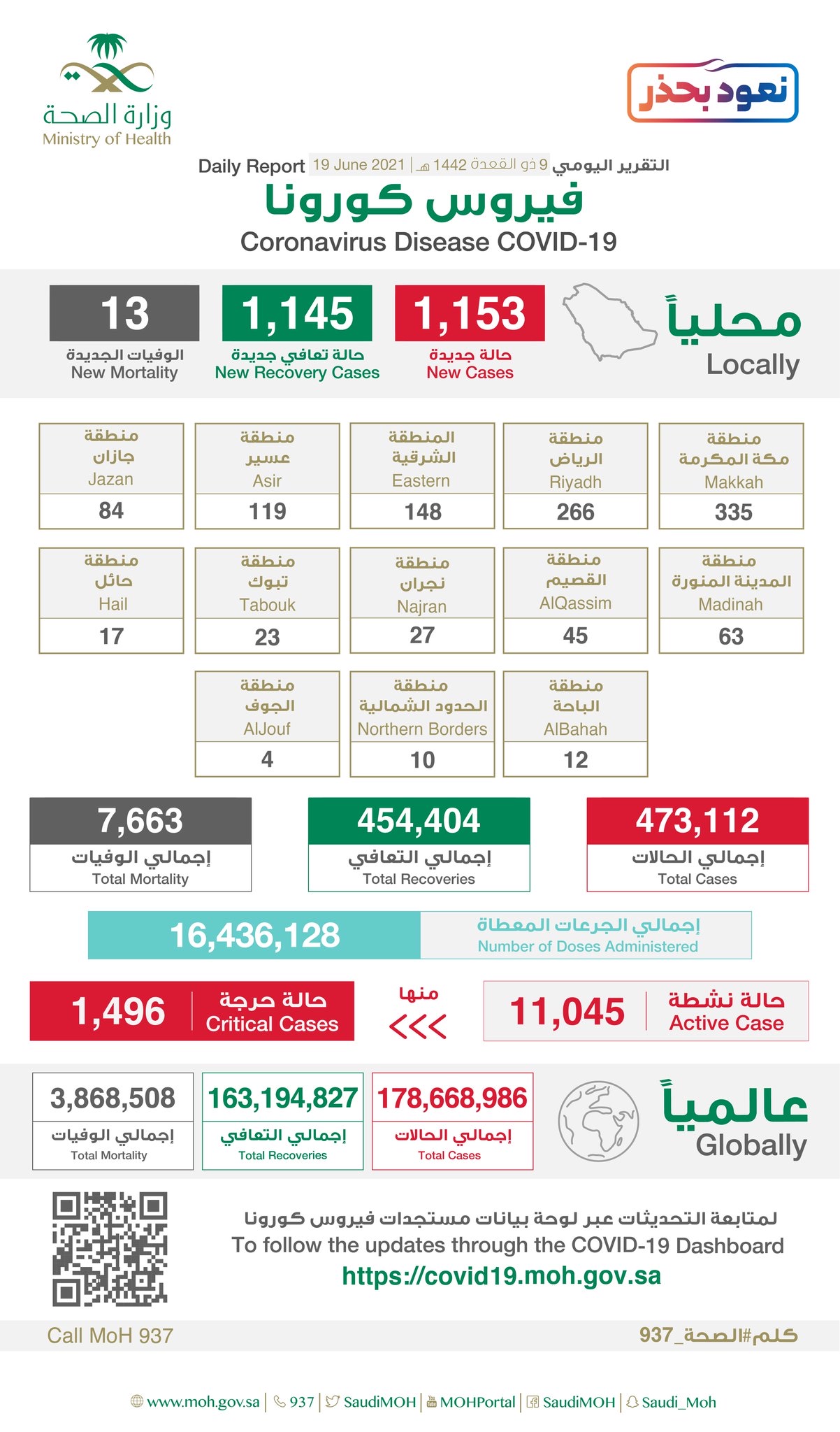 كما أعلنت الصحة عن تسجيل ”1145“ حالة تماثلت للشفاء، ليصل مجموع المتعافين إلى ”454404“ حالة تعافي، فيما ارتفع إجمالي الوفيات في المملكة إلى 7663 حالة بعد تسجيل ”13“ حالة وفاة جديدة.