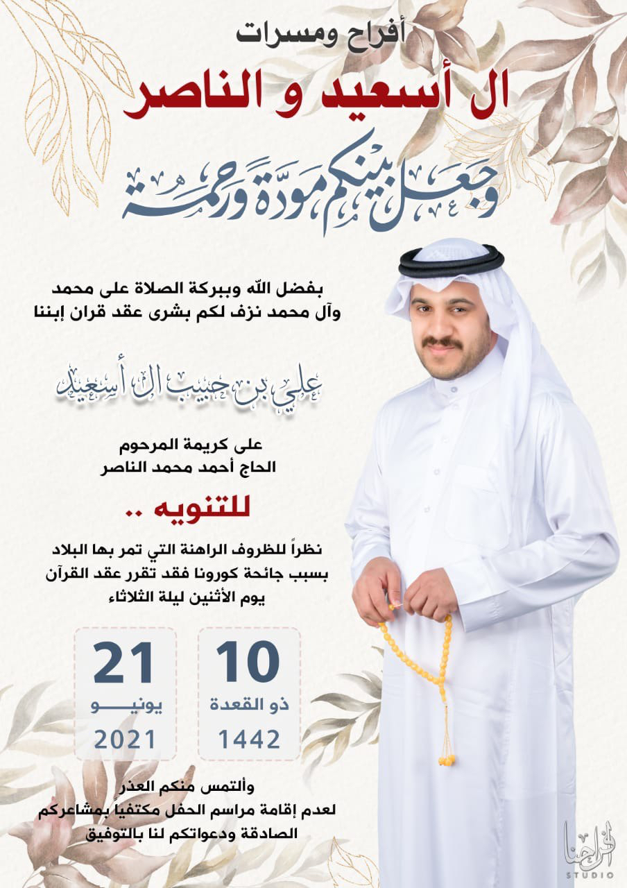 احتفلت عائلة آل اسعيد والناصر في صفوى مساء يوم الإثنين بعقد قران الشاب علي حبيب آل اسعيد على كريمة الحاج أحمد محمد الناصر وسط فرحة الأهل والأصدقاء ومحبي العريسين.