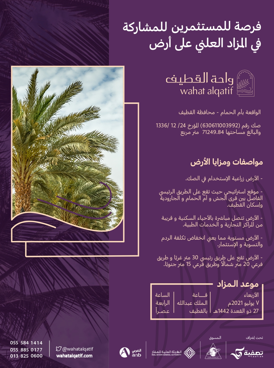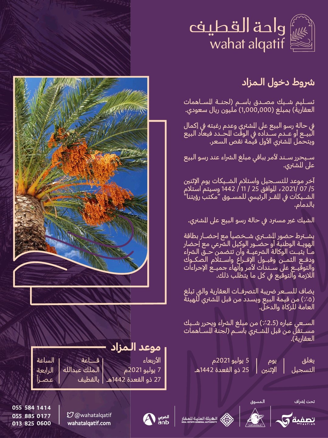 طرح أرض واحة القطيف في مزاد علني في السابع من يوليو القادم