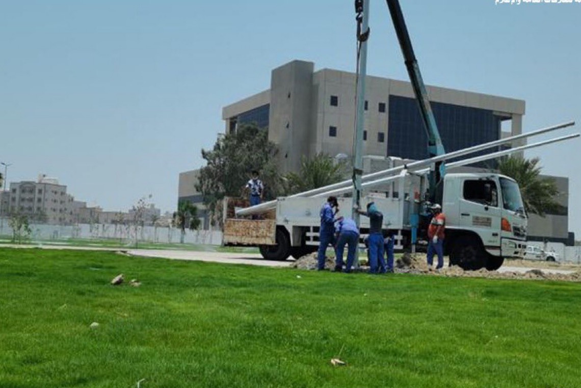 بدأت بلدية محافظة القطيف، أعمال تركيب أعمدة إنارة في حديقة الخزامى بعنك.
