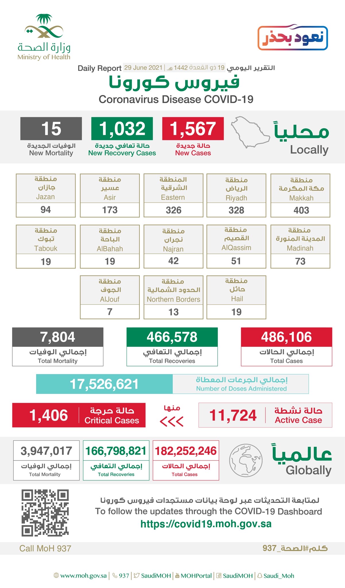 أعلنت وزارة الصحة إحصائية جديدة لمستجدات كورونا في المملكة خلال ال 24 ساعة الماضية تضمنت تسجيل 1567 حالة مؤكدة. منها ”7“ في القطيف.