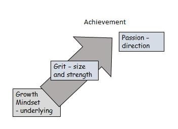 الرسم التوضيحي: المقل الايجابي - أو ذهنية النمو - هو أساس تحقيق نجاح الفرد، الانضباط الذاتي - أو الشغف والمثابرة - يحدد قوة ونطاق الجهد المبذول. الشغف يحدد التوجه، أي الشيء يصبح الفرد جيدًا فيه. مصدر الرسم: هيرموندور، جامعة NTNU.
