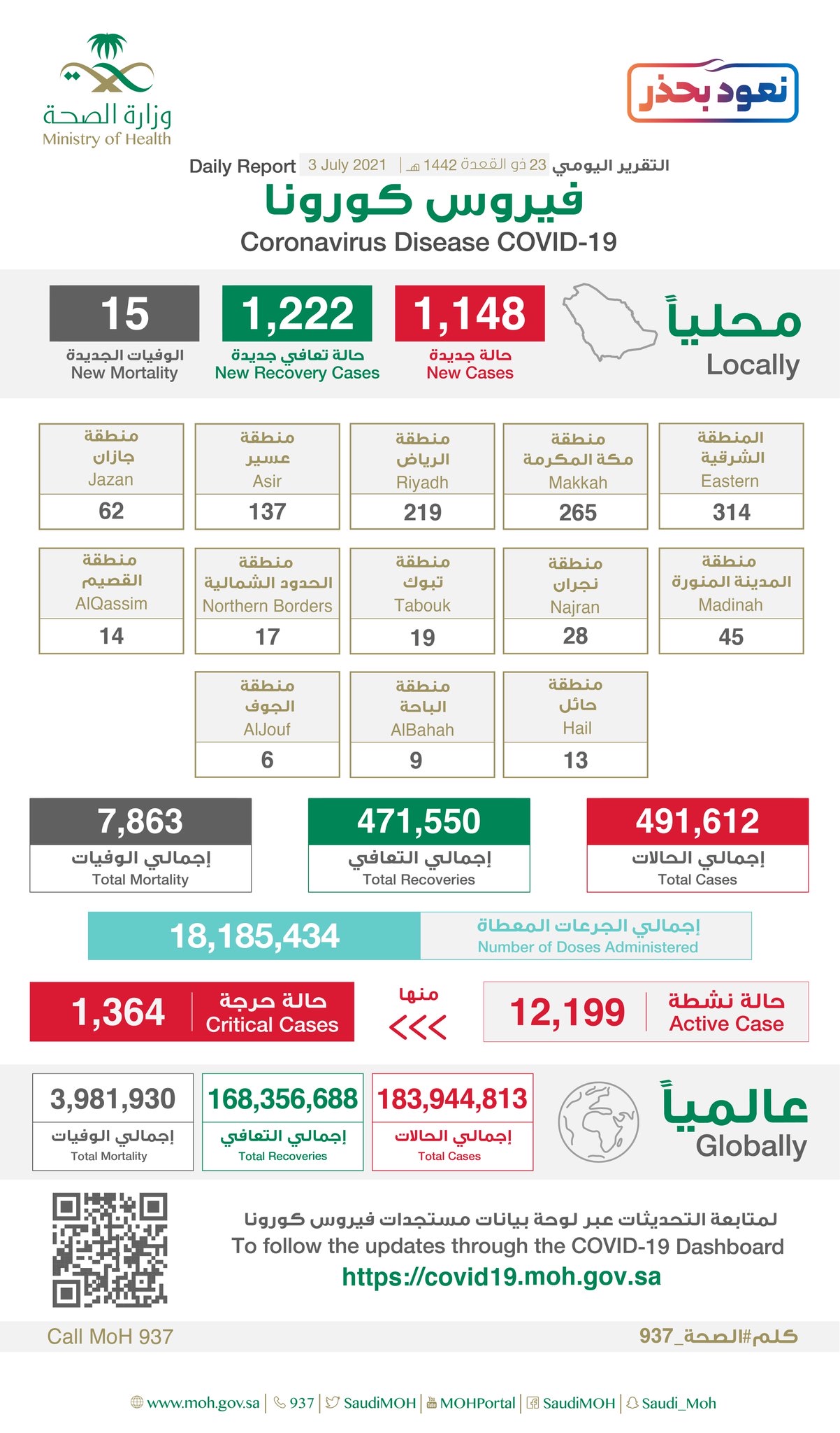 وبلغ إجمالي الحالات النشطة 12199 حالة، منها 1364 حالة حرجة.