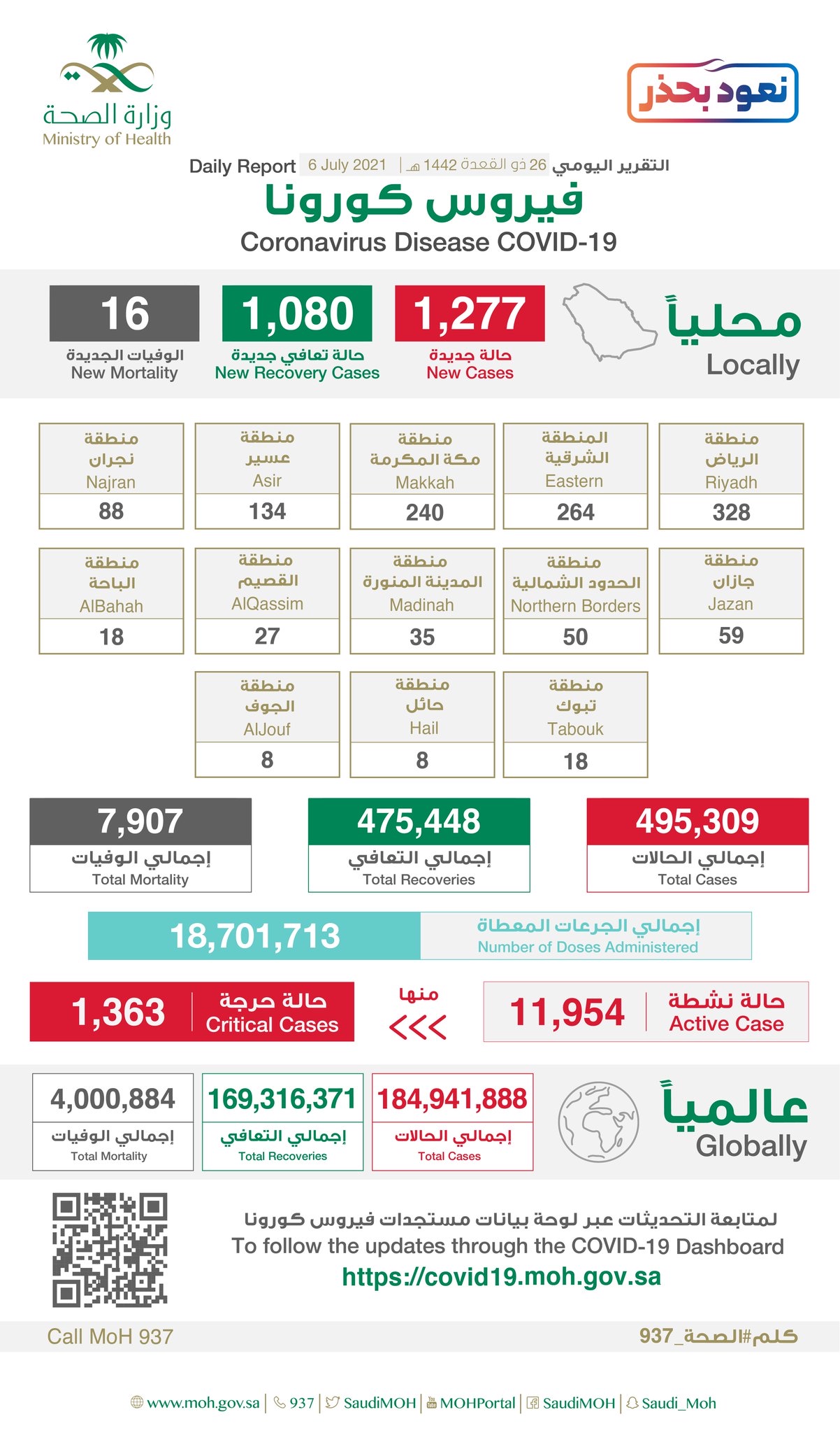 كما أعلنت الصحة عن تسجيل ”1080“ حالة تماثلت للشفاء، ليصل مجموع المتعافين إلى ”475448“ حالة تعافي، فيما ارتفع إجمالي الوفيات في المملكة إلى 7907 حالة بعد تسجيل ”16“ حالة وفاة جديدة.