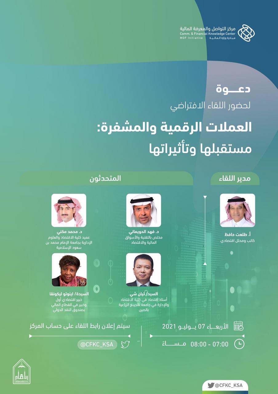 يقيم مركز التواصل والمعرفة المالية ”متمم“ لقاءً افتراضياً بعنوان: ”العملات الرقمية والمشفرة: مستقبلها وتأثيراتها“ وذلك مساء يوم الأربعاء، ضمن سلسلةٍ من اللقاءات الافتراضية التي يهدف المركز من خلالها إلى الإثراء المعرفي في الجوانب الاقتصادية والمالية.