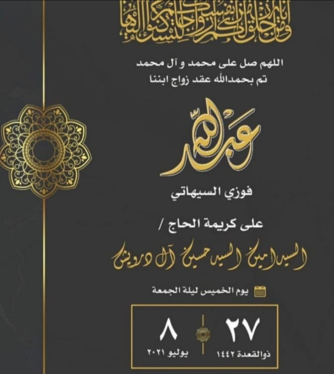 تحتفل عائلة السيهاتي وآل درويش في سيهات مساء يوم الخميس بعقد قران الشاب عبدالله فوزي السيهاتي على كريمة الحاج السيد أمين السيد حسين آل درويش وسط فرحة الأهل والأصدقاء ومحبي العريسين.