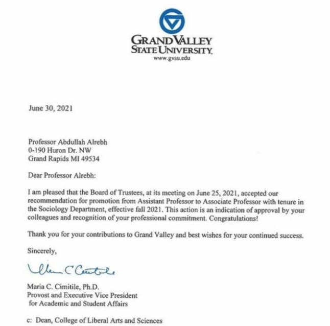 احتفل الدكتور عبدالله فيصل الربح بقرار المصادقة على ترقيته إلى رتبة أستاذ مشارك بقسم علم الإجتماع بجامعة جراند فالي بولاية مشغن بالولايات المتحدة الأمريكية.