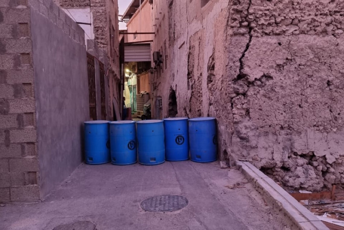 ”براميل الحاويات الخمسة“، المصفوفة في الطريق الضيق بأحد أزقة حي الديرة بجزيرة تاروت، تعتبر دلالة على خطورة استخدام الطريق من لدن المارة.