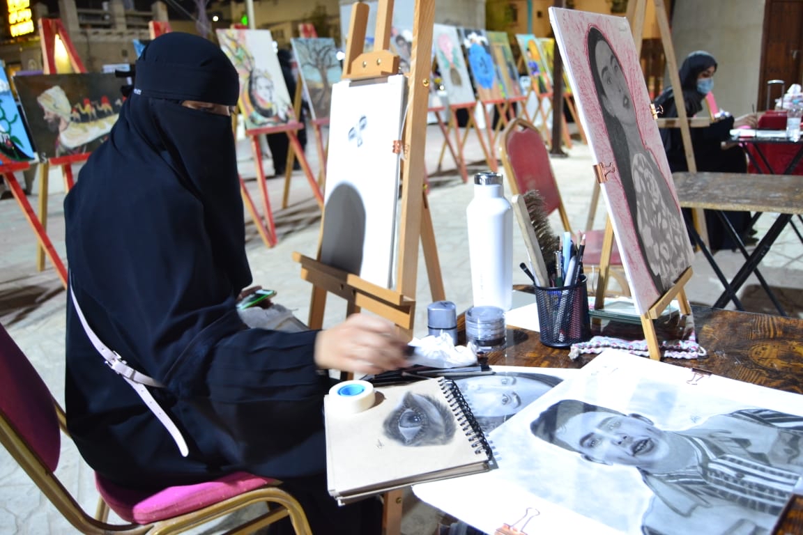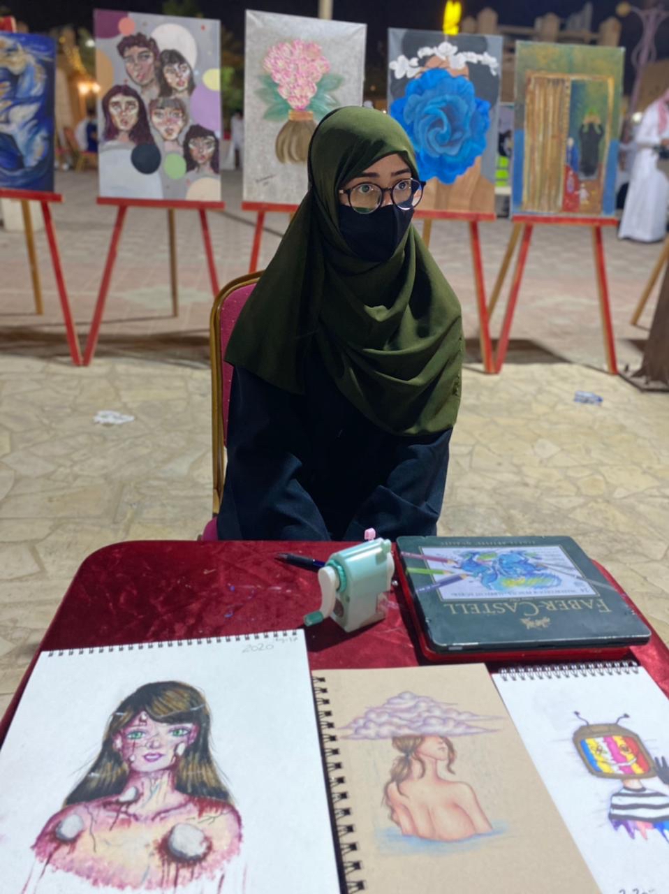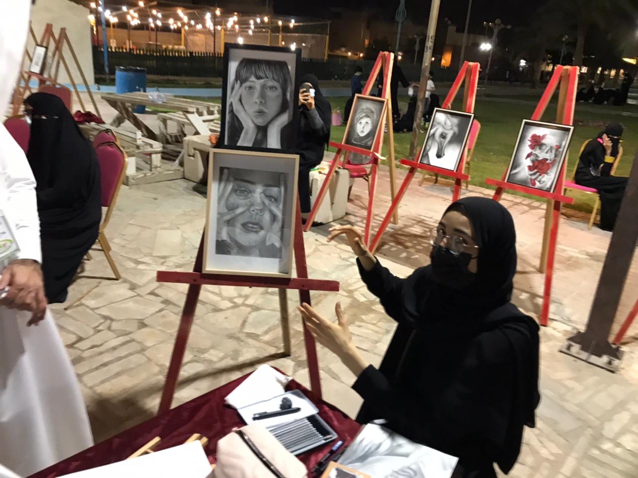 وبدورها، قالت الفنانة التشكيلية ”سارة الهداف“: إن التميز دائما لهمسات والنشاط جميل وتواجد الفنانات دافع لنا بالعطاء، وأنني مشاركة بالرسم المباشر وعرض اللوحات الفنية، والفنانة زينب البخيتان تخصص الفنون خريحة جامعه فيصل.