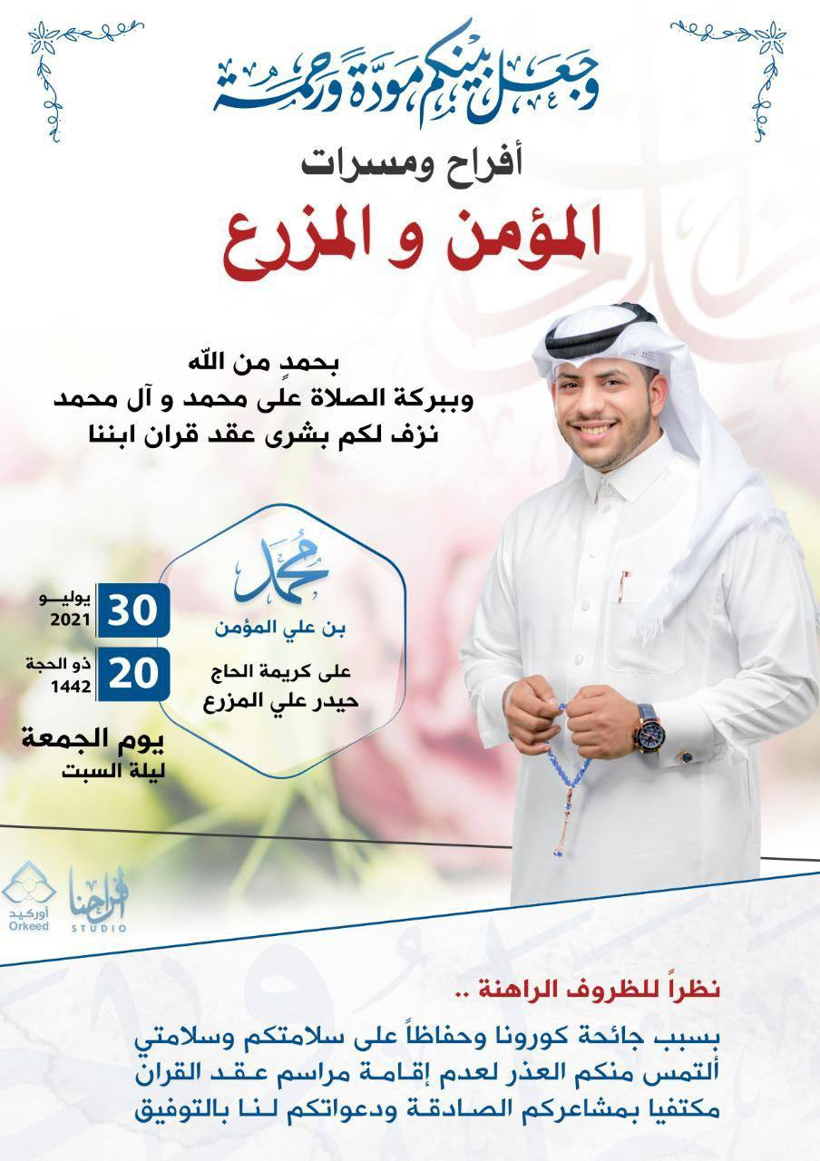 احتفلت عائلة المؤمن والمزرع في صفوى مساء يوم الجمعة بعقد قران الشاب محمد علي المؤمن على كريمة الحاج حيدر علي المزرع وسط فرحة الأهل والأصدقاء ومحبي العريسين.