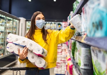 في مواجهتهم لحالة عدم اليقين الجديدة هذه، بدأ المتسوقون في تخزين المواد المنزلية الأساسية - خاصة ورق التواليت - لأخذ المجهول الجديد بعين الاعتبار. أدى هلع الشراء هذا إلى نقص في المواد، على الرغم من أنه، في معظم الحالات، يوجد ما يكفي للجميع لو اشترى الناس ما يحتاجون إليه فحسب.
