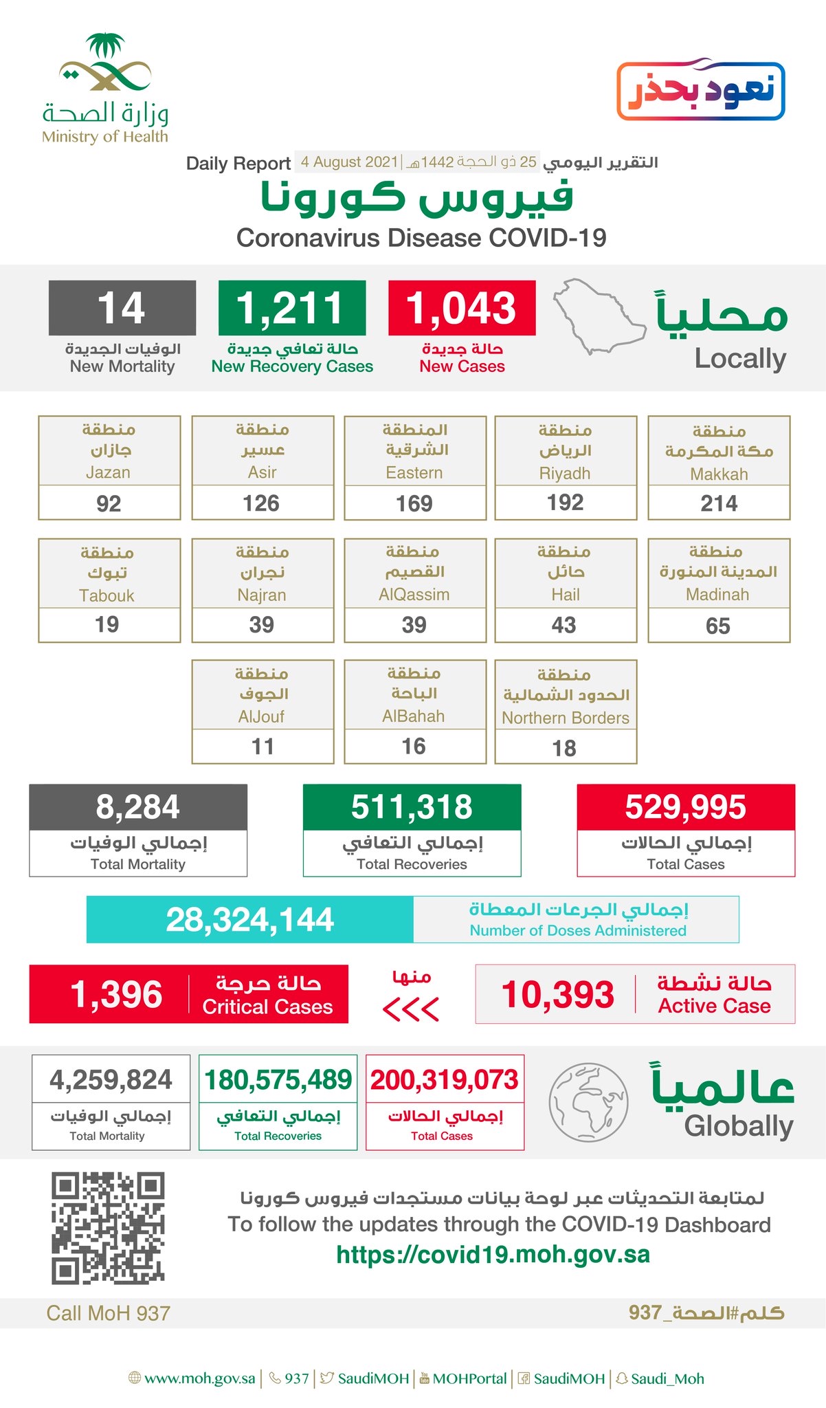 كما أعلنت الصحة عن تسجيل ”1211“ حالة تماثلت للشفاء، ليصل مجموع المتعافين إلى ”511318“ حالة تعافي، فيما ارتفع إجمالي الوفيات في المملكة إلى ”8284“ حالة بعد تسجيل ”14“ حالة وفاة جديدة.