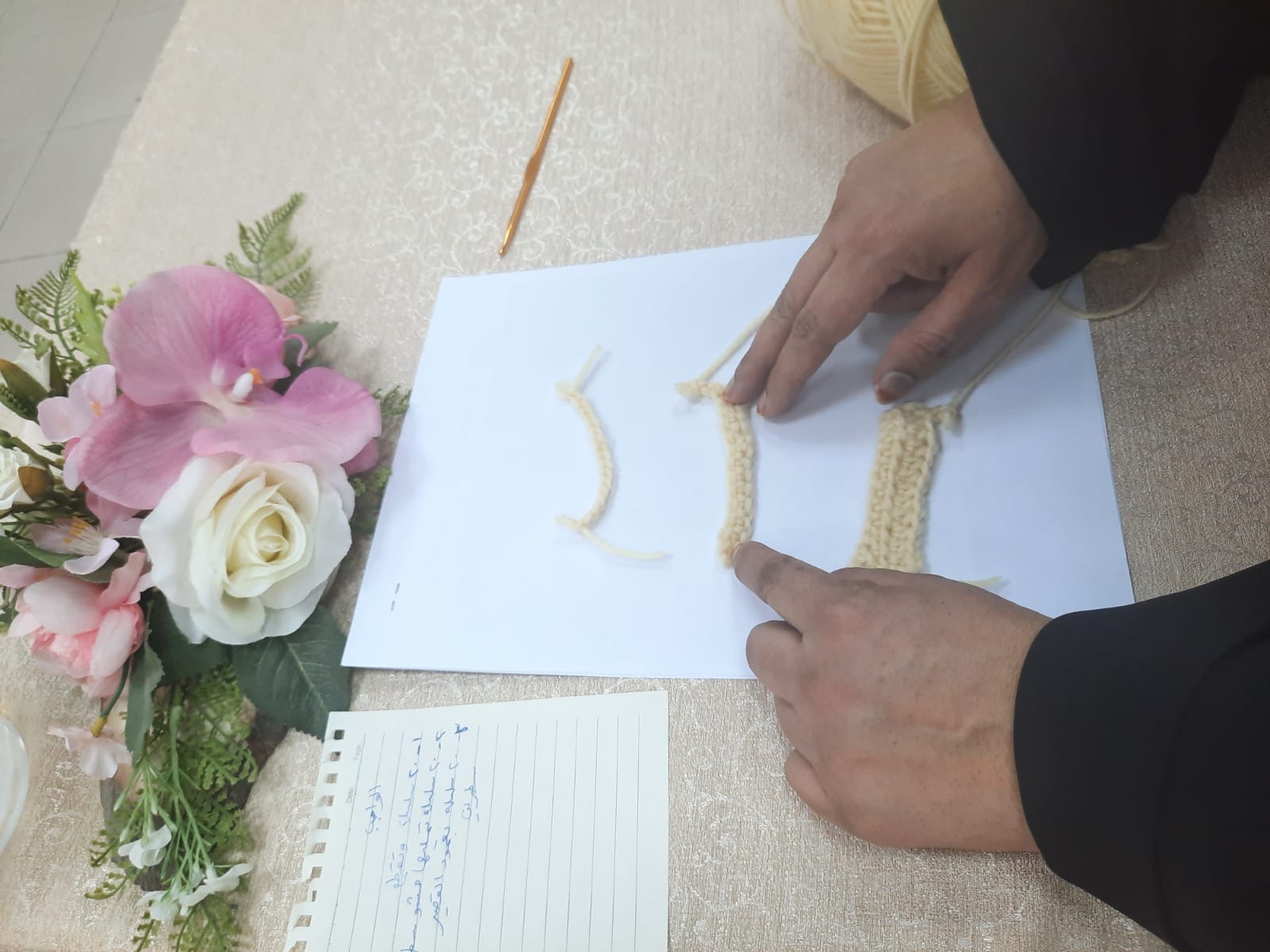 واستعرضت الشرقي من خلال اللقاء عددًا من المحاور كالتدريب على الغرز الأساسية وأنواعها، ومسكة الإبرة، وعمل عقدة البداية، وقراءة الباتر ونات المرسومة والمكتوبة طرق العناية بالمنتوجات؛تطبيق عمل قبعة ووردة بطبقتين.