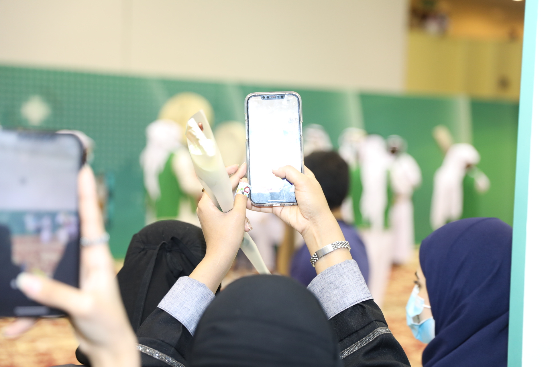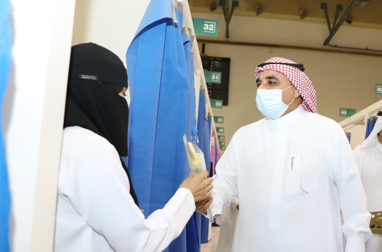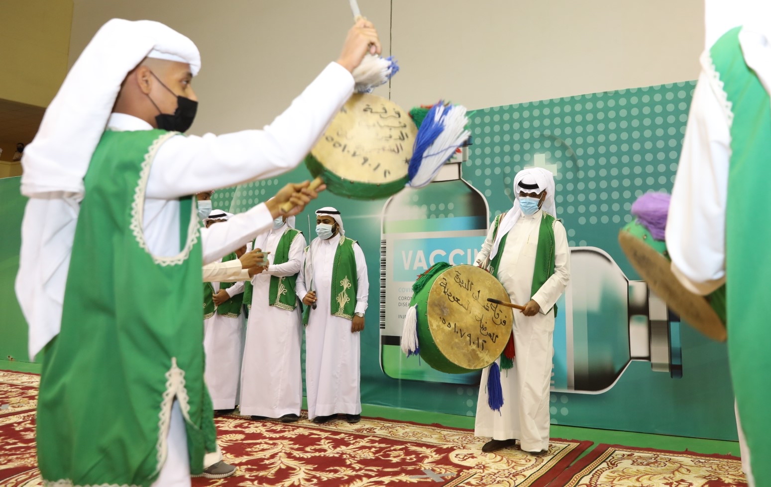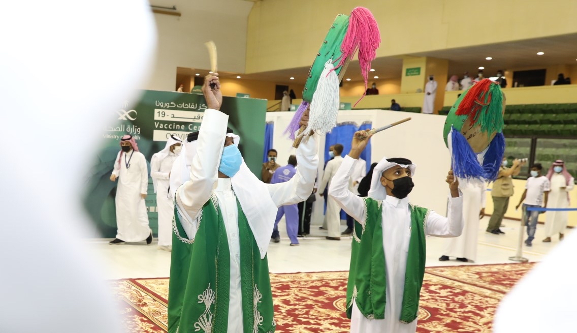 وسط اصطفاف المستفيدين حين دخولهم الغرف المخصصة لتلقي لقاح فيروس ”كورونا“، في مركز اللقاحات بمدينة الأمير عبدالله بن جلوي الرياضية، الذي يشهد إقبال واسع من المواطنين والمقيمين رغبةً في حصولهم على ”التحصين“، قُرعت الدفوف والطبول لتدوي القاعة بالأهازيج الوطنية التي قادتها فرقة العرضة السعودية، احتفالاً بأبطال الصحة.
