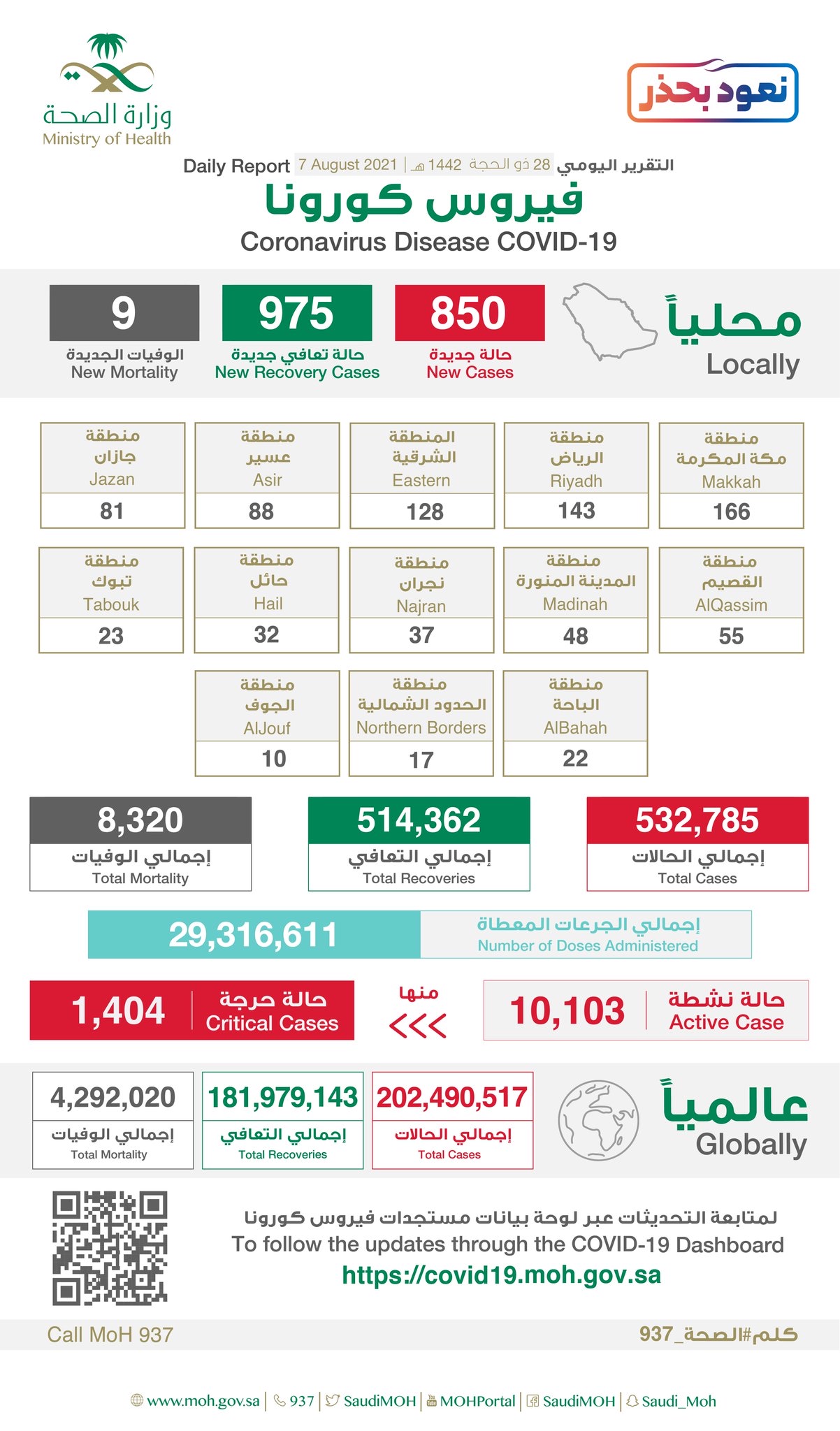 كما أعلنت الصحة عن تسجيل ”975“ حالة تماثلت للشفاء، ليصل مجموع المتعافين إلى ”514362“ حالة تعافي، فيما ارتفع إجمالي الوفيات في المملكة إلى ”8320“ حالة بعد تسجيل ”9“ حالة وفاة جديدة.