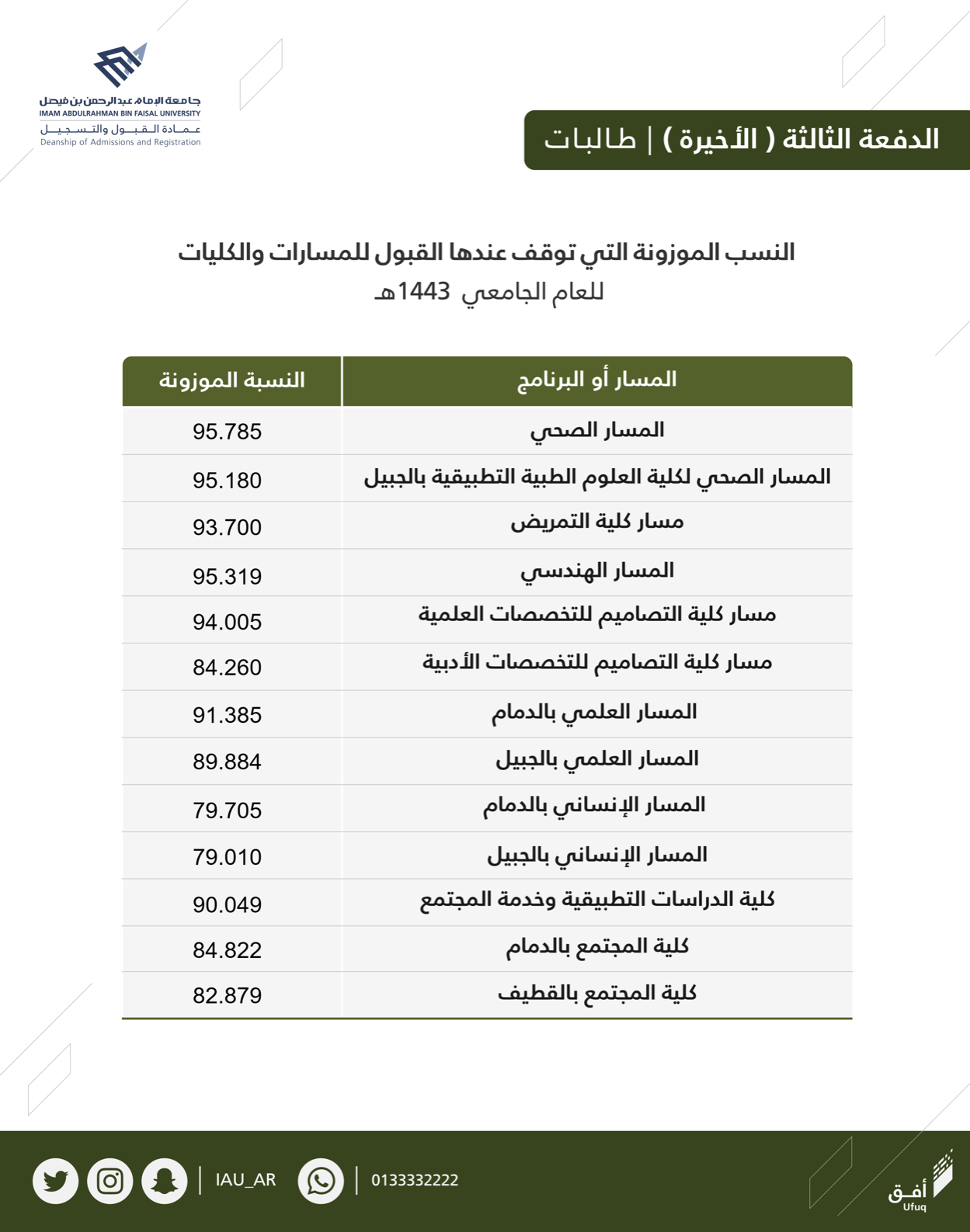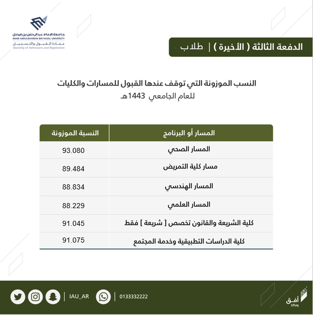 أعلنت جامعة الإمام عبدالرحمن بن فيصل ممثلة بعمادة القبول والتسجيل عن الدفعة الثالثة من الطلاب والطالبات المرشحين والمرشحات للقبول في مسارات السنة التحضيرية والبرامج الأخرى للعام الجامعي القادم 1443ه.