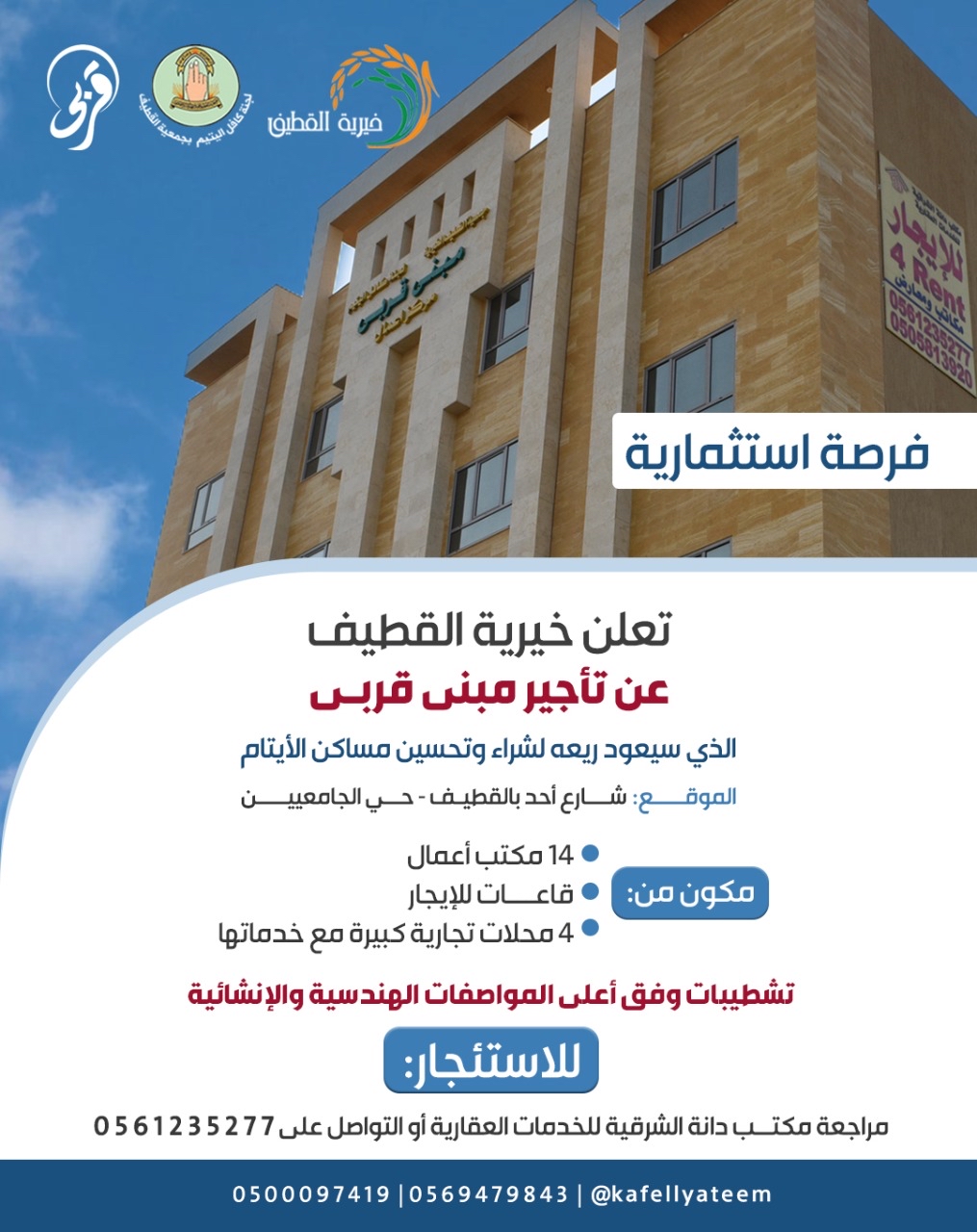 ‏كشفت جمعية القطيف الخيرية، عن رغبتها في تأجير ”مبنى قربى“، التابع للجنة كافل اليتيم، ويعود ريعه لشراء وتحسين مساكن الأيتام، والواقع في حي الجامعيين على شارع أحد بالقطيف.