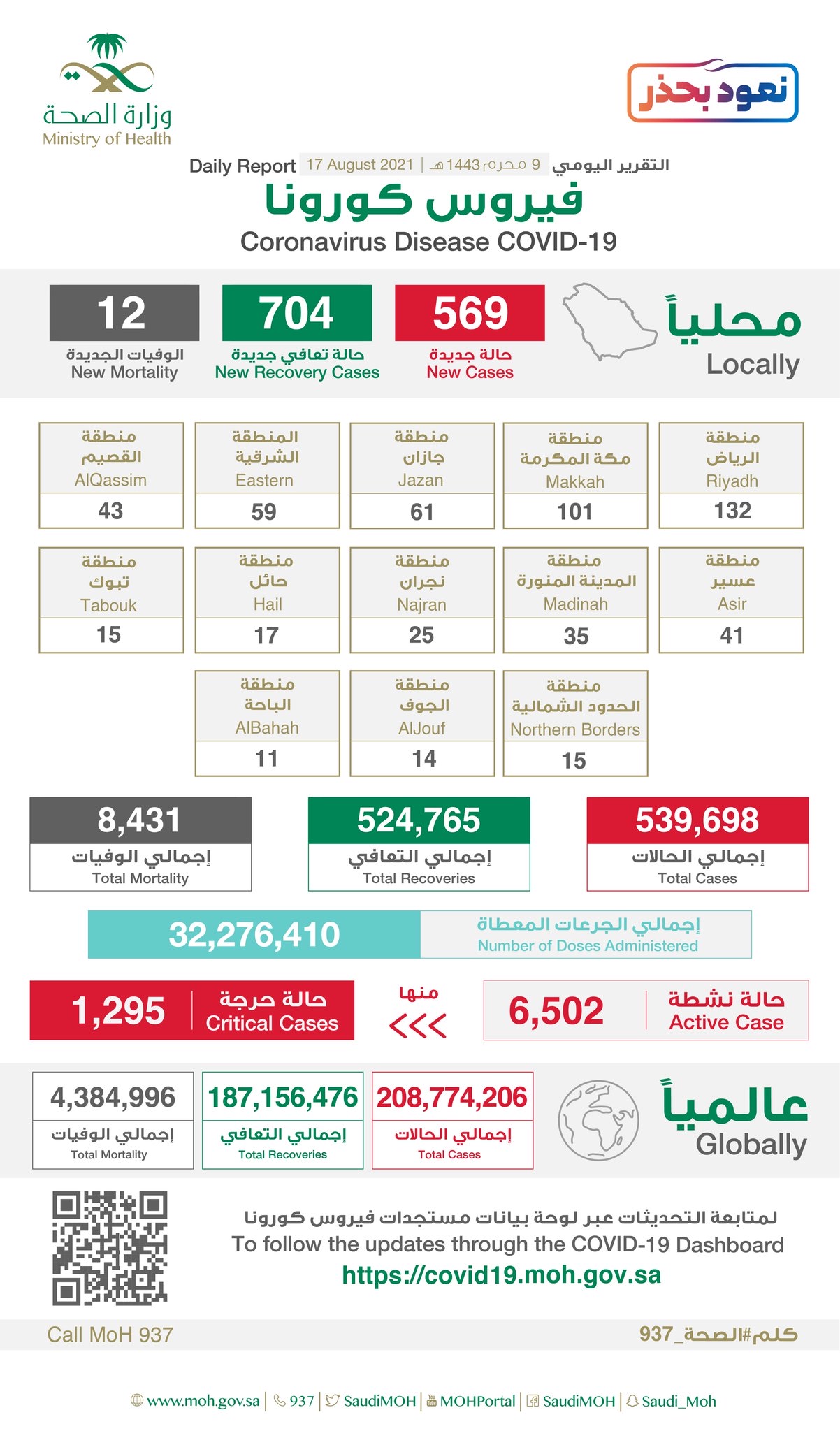 وتتيح وزارة الصحة الاطلاع على مستجدات الفايروس في المملكة، وذلك بنشر إحصاءاتها اليومية على الموقع الإلكتروني https://covid19.moh.gov.sa.