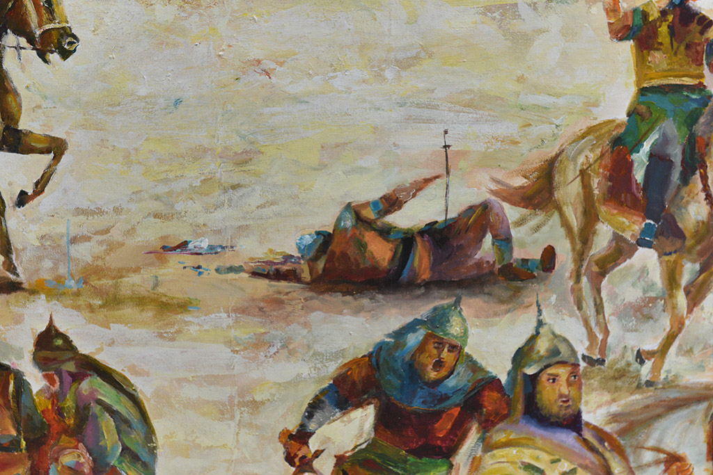 وبريشة فرشاة صغيرة لا تتجاوز 2 ملم ولها مكانة خاصة عنده، رسم الحجي في لوحته 140 شخصا ما بين مقاتل وإمرأة وطفل و90 خيلا وجملا في عمل دأب عليه طيلة السنوات الثلاث.