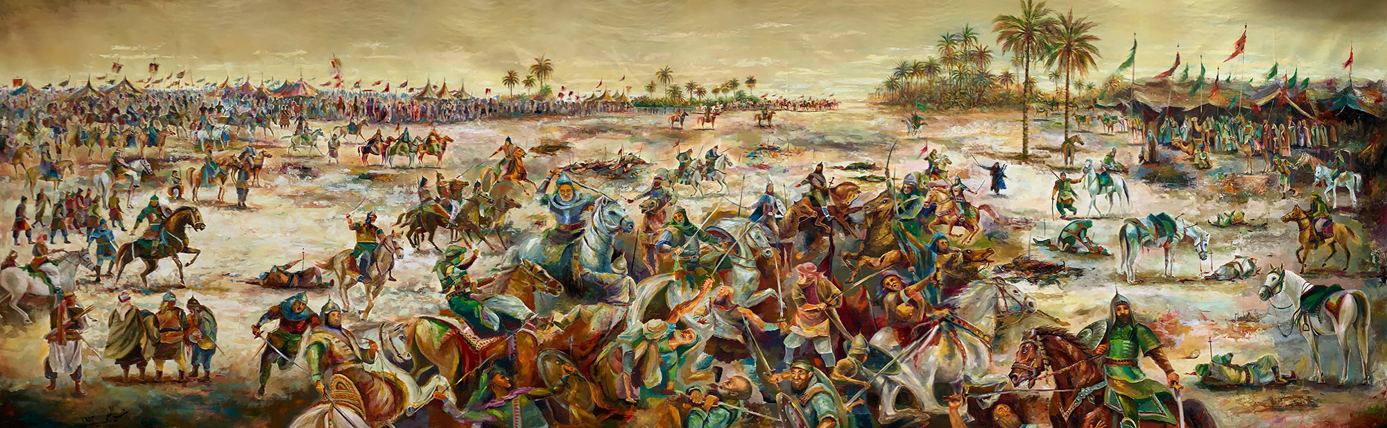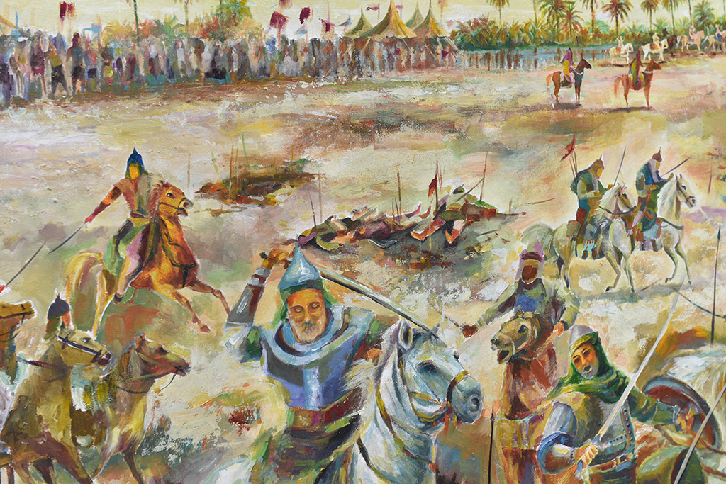 في آخر روائعه الفنية جسد الفنان التشكيلي المعروف منير الحجي بريشته الذهبية ملحمة كربلاء التاريخية في لوحة فنية بعنوان ”من القطيف إلى كربلاء“.