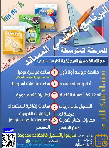 برنامج تعليمي مساند لمادة الرياضيات وللمرحلة المتوسطة للطلاب والطالبات بدروس مباشرة عن بعد توازي الدروس المدرسية
