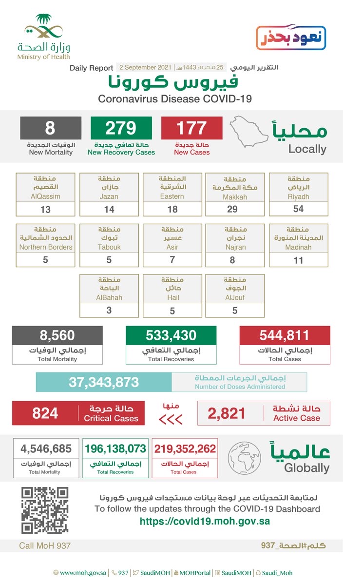 كما أعلنت الصحة عن تسجيل ”279“ حالة تماثلت للشفاء، ليصل مجموع المتعافين إلى ”533430“ حالة تعافي، فيما ارتفع إجمالي الوفيات في المملكة إلى ”8560“ حالة بعد تسجيل ”8“ حالة وفاة جديدة.