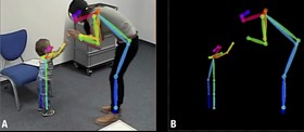 مثال على استخلاص "هيكل الجسم skeleton «مخطط الجسم الخارجي» باستخدام برنامج OpenPose على صورة مستخرجة من تسجيل ڤيديو لمشهد اجتماعي: «A» نقاط OpenPose أساس مركبة على تسجيل ڤيديو، و«B» نقاط OpenPose أساس مركبة على خلفية سوداء، مع الاحتفاظ بالحد الأدنى ميزات «ملامح» المشهد الضرورية للتعرف على التفاعل الاجتماعي. المصدر: كوجوفيتش وآخرون، جامعة جنيڤ