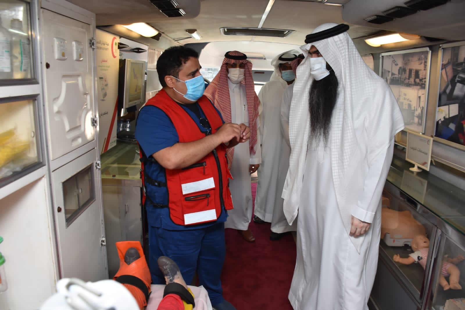 وتخلل الفعاليات المقامة عرض لحافلة المعرض التثقيفي وما تحتويه من نموذج لغرفة العمليات وكابينة مركبات الإسعاف والدمى التدريبية والأجهزة الطبية الحديثة المستخدمة في العمل الإنساني الإسعافي.