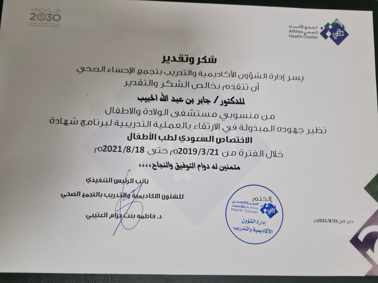 لذا فإن هذا التميز في الحصول على هذه النسبة العالية يعكس ثمرة جهود د. جابر الحبيب في السمو بالبرنامج نحو الأفضل، وكذلك دعم رئاسة قسم الأطفال للبرنامج، ومشاركة الأطباء الاستشاريين في مختلف اختصاصاتهم في العملية التعليمية لأطباء البورد.