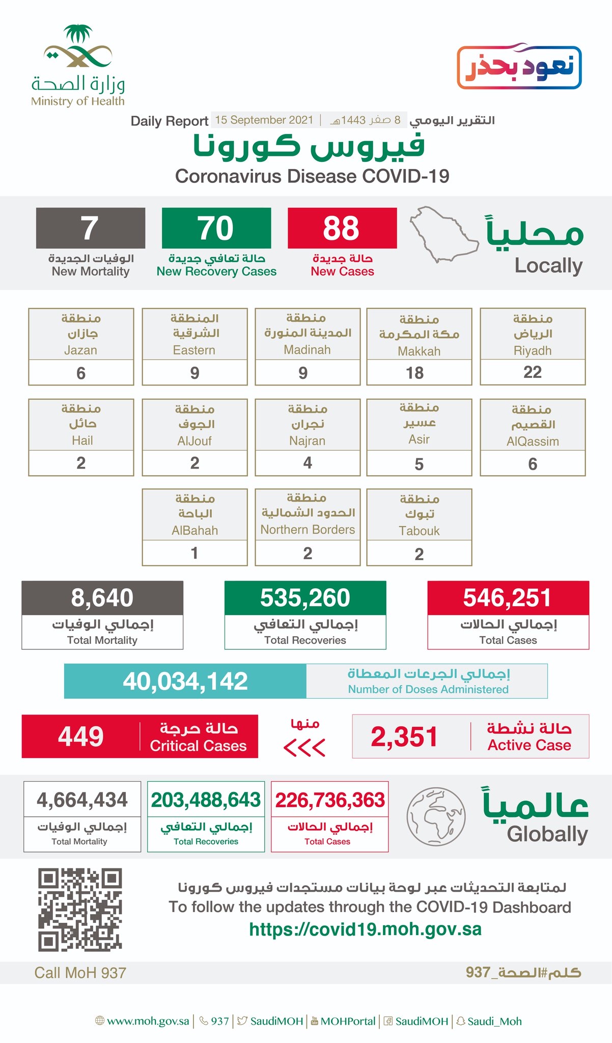 وبلغ إجمالي الحالات النشطة ”2351“ حالة، منها ”449“ حالة حرجة.