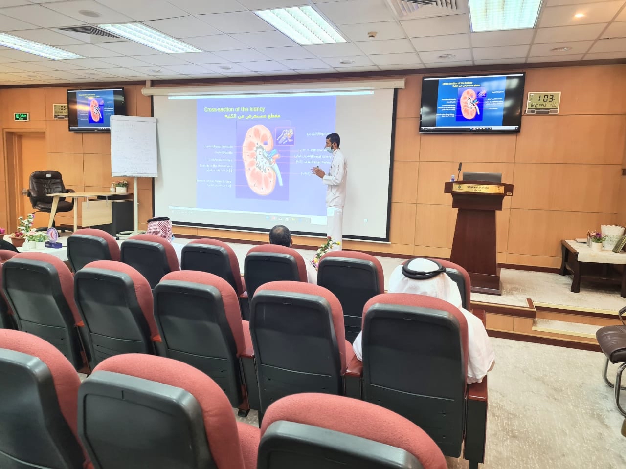 شملت المحاضرة عدة محاور، أهمها وظائف الكلى، والعوامل الخطرة، ومسببات الفشل الكلوي، بالإضافة الى طرق العلاج.