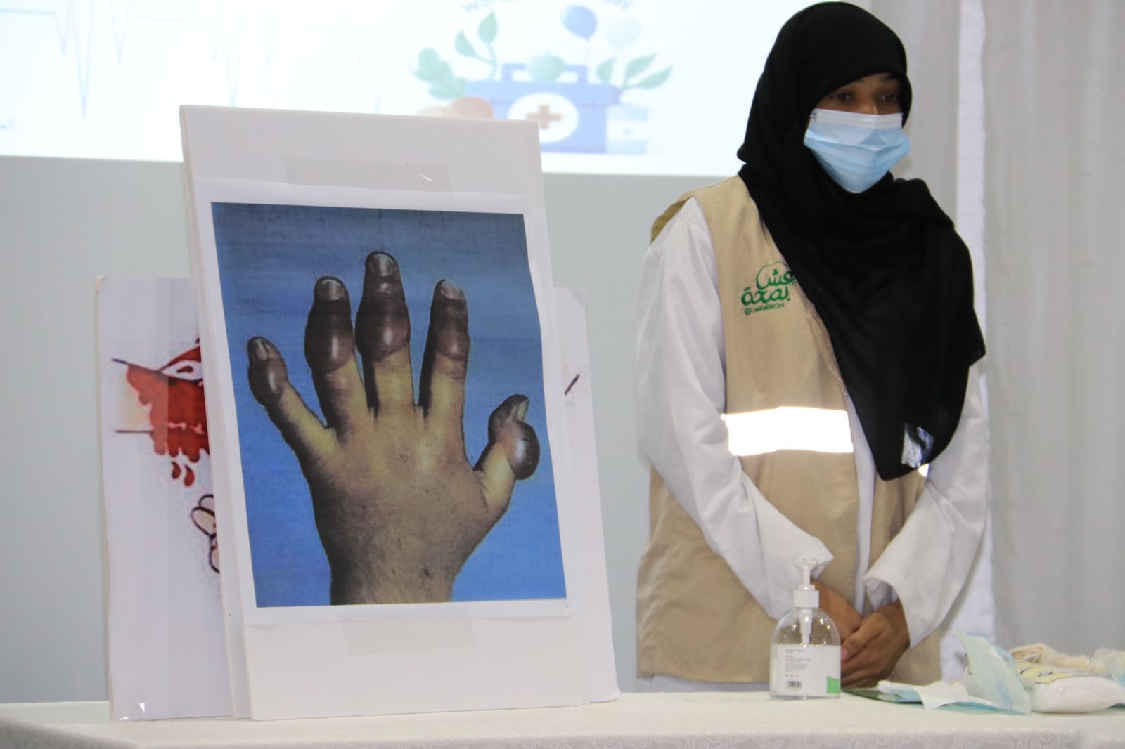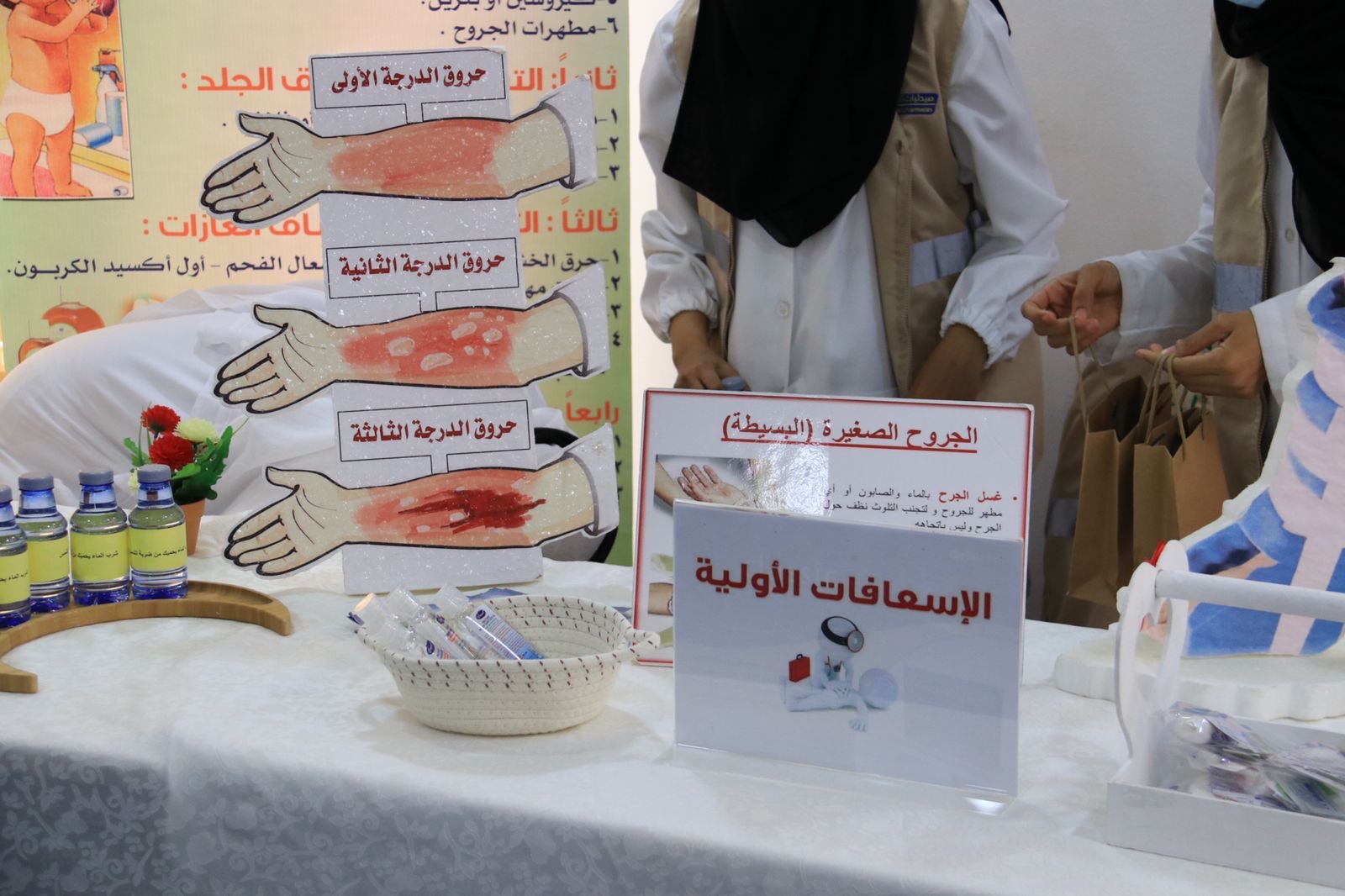 وعلى نفس السياق تم استعراض طرق عمليه على الدمى ممكن تصادف المنسوبي أثناء العمل مع المستفيدين من ذوات الإعاقة مثل «اسعاف الكسور - الحروق - النزف - الإغماء - ضربة الشمس - الصدمة الكهربائية - الغرق - الغصة - انسداد مجرى الهواء - الصرع - السكري - ازمة الربو - الأزمة القلبية - بالإضافة الى صفات وشروط المسعف الأولي ومحتويات حقيبة الإسعافات الأولية والتسمم الغذائي»